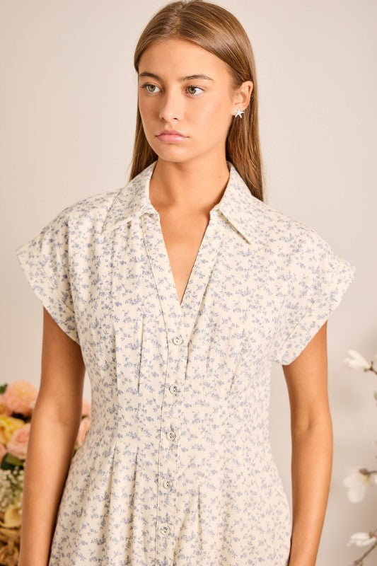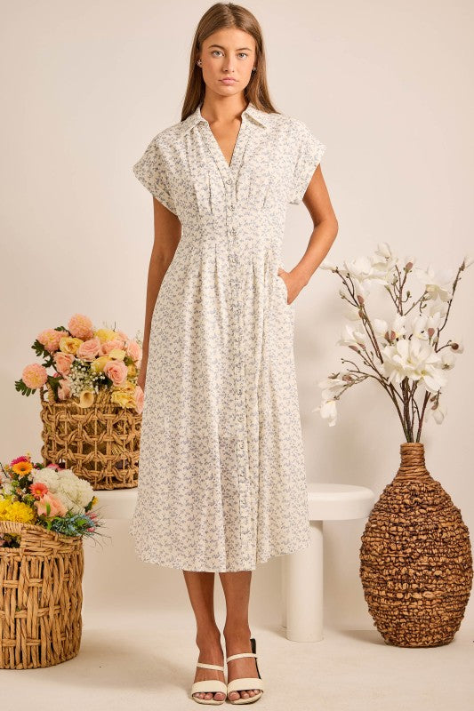 Stay fresh and feminine with our Floral Button-Front Midi Dress, available in Yellow and Blue. Lightweight fabric with delicate all-over floral print Button-front closure with collared neckline Relaxed short sleeves and side pockets for comfort Midi length with flowy silhouette Perfect for spring brunches, garden parties, or summer vacations