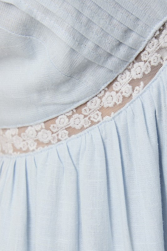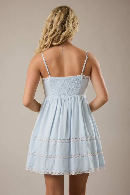 The Agatha Dress is a charming baby blue mini dress designed with delicate lace detailing and trim throughout. Perfect for special occasions or elevated everyday wear, this piece combines soft color with romantic lace accents for a graceful, feminine look. The mini silhouette offers a modern, flattering cut that works beautifully for various seasons and settings.
