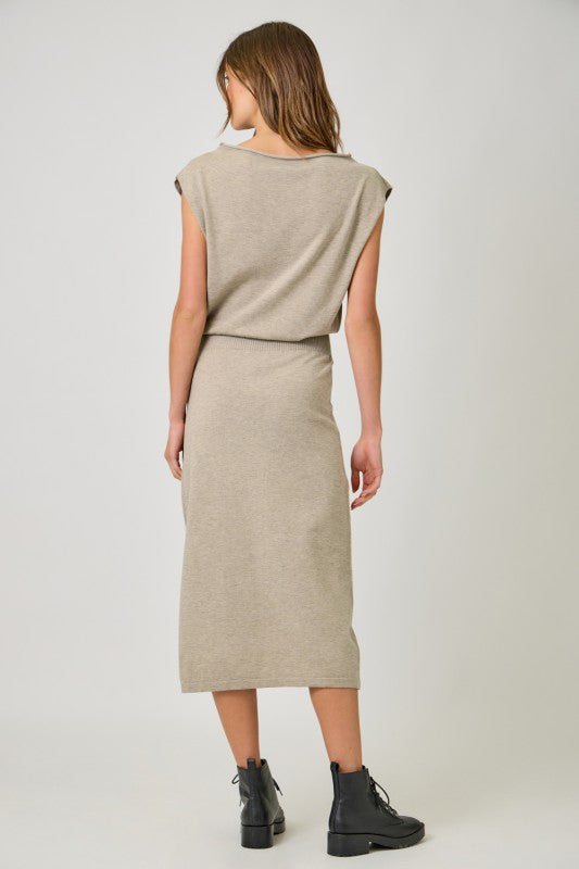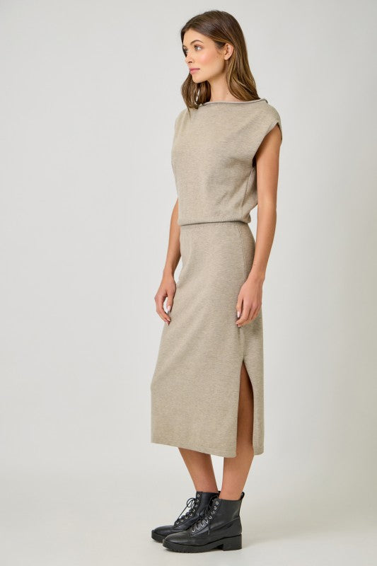 Sleeveless Sweater Dress Boat neck Skirt slit Midi length Cinched ribbed knit waist -45% Nylon, 30% Polyamide, 19% Acrylic, 6% Wool -Model wears: S / Model height: 5' 9.5"