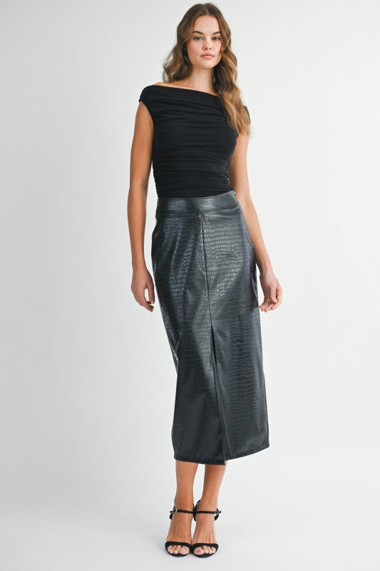 Ruched knit off-the-shoulder top. Slim, stretch fit with gathered sides. Pullover style.