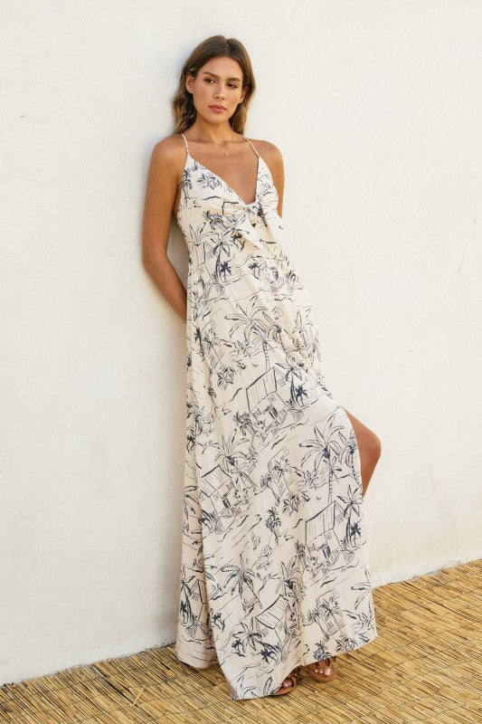 Conversation print maxi dress with a knot detail. Model is 5'8" and wearing size Small. - Plunging neckline - Knot detail on the front chest - Back zipper closure on the skirt - Adjustable shoulder tie closure to the back - Front slit - Lined Shell: 80% Rayon, 20% Linen Lining: 100% Rayon