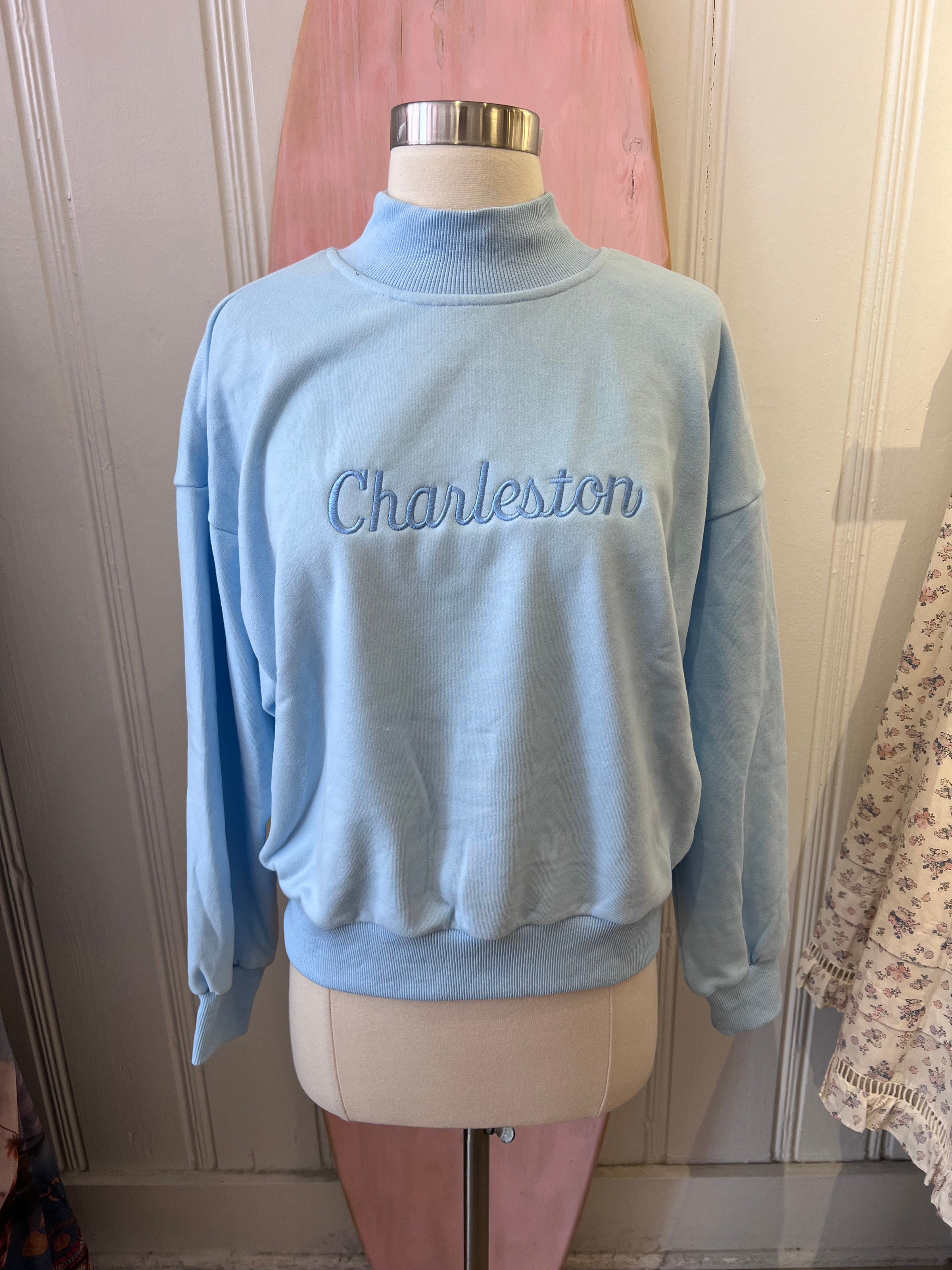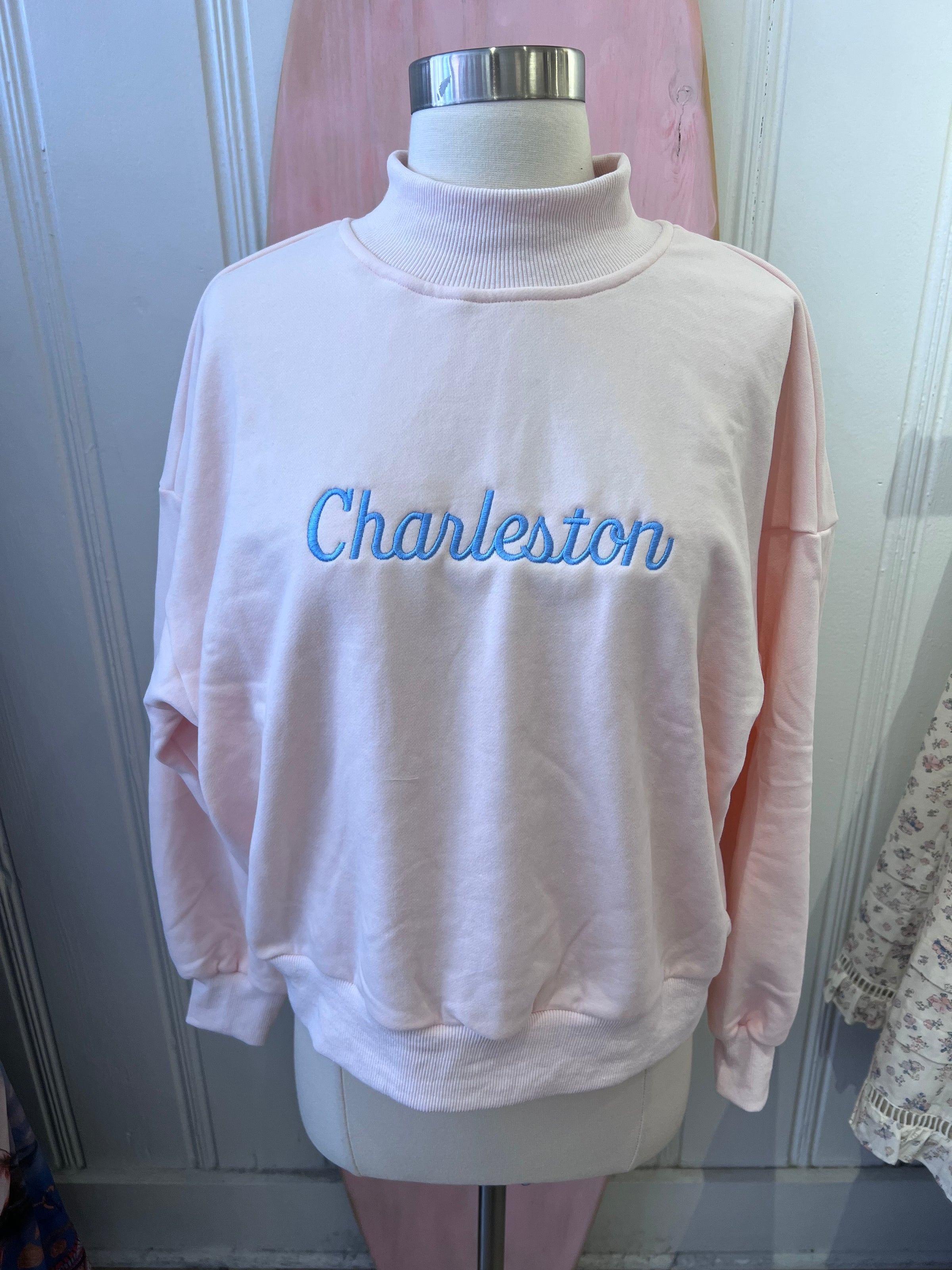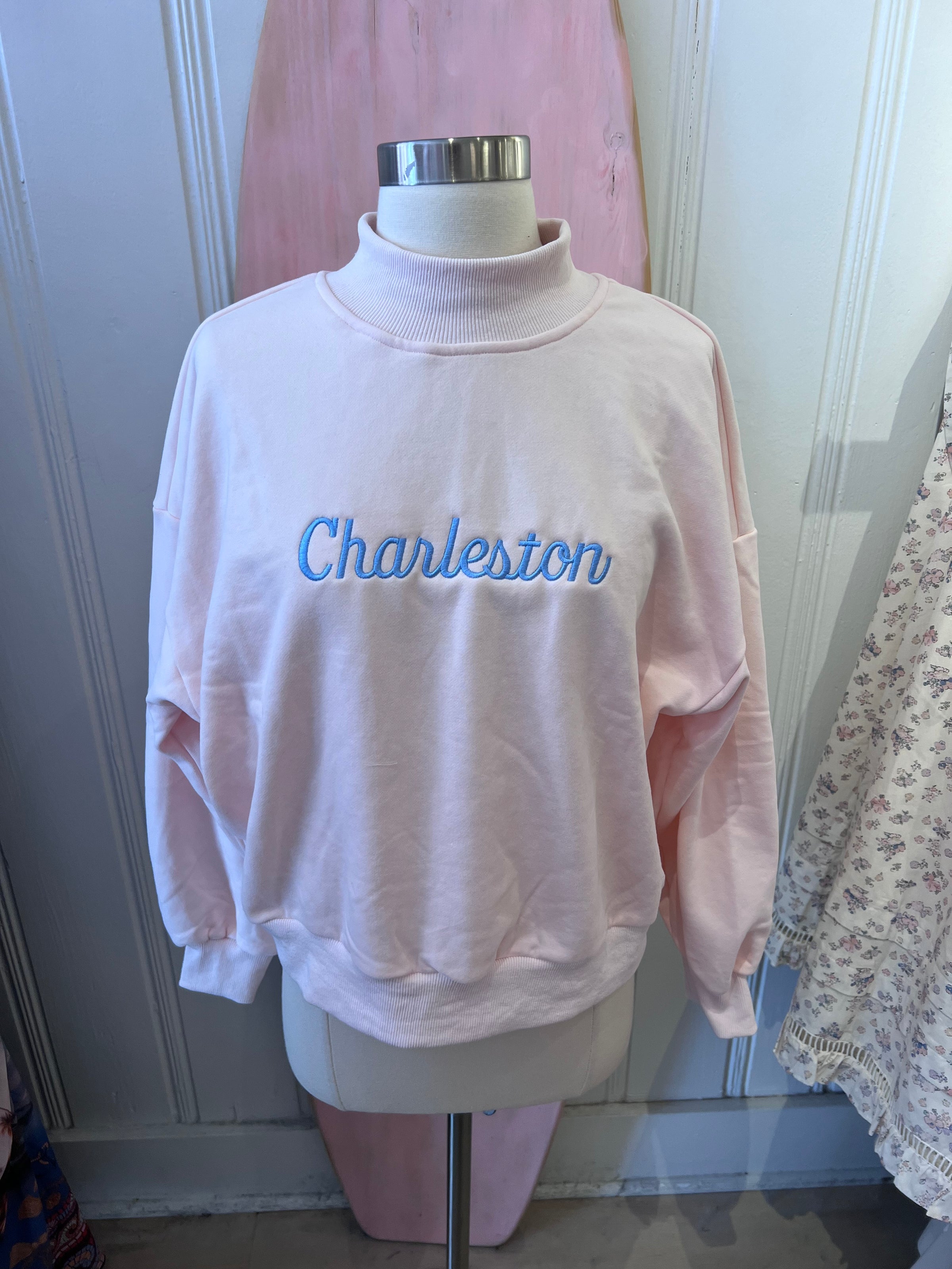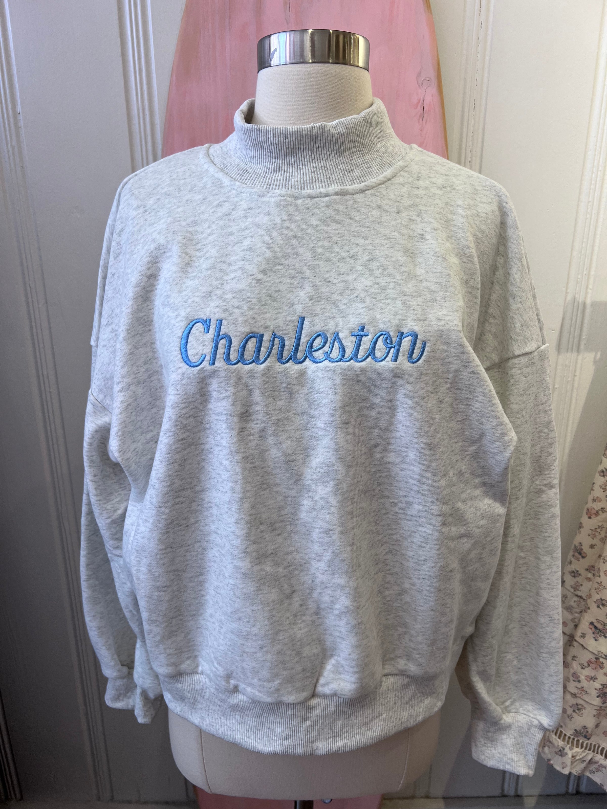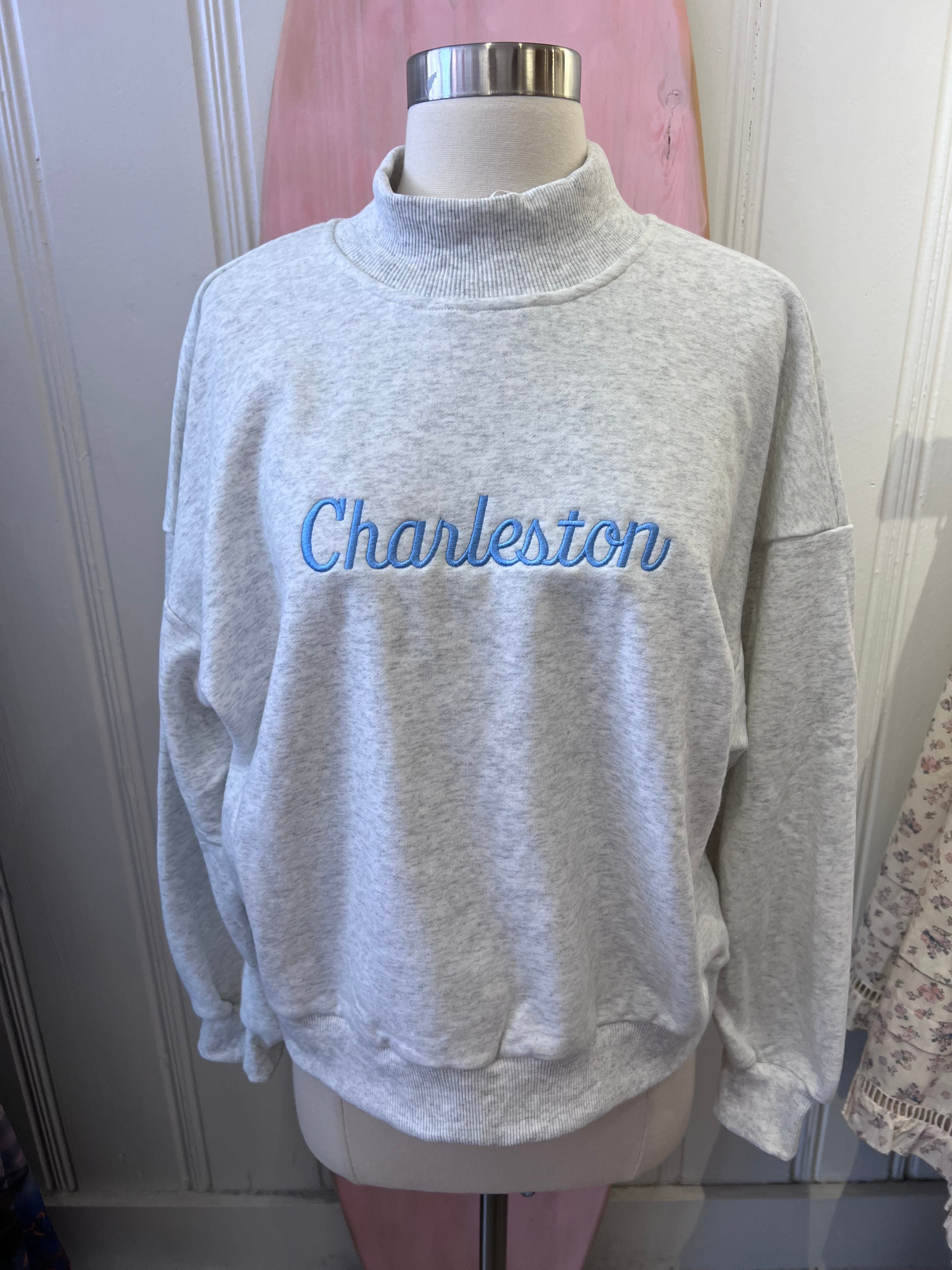 Mock Neckline Lounge Set with Charleston Embroidered on Mockneck Effortless comfort meets modern minimalism in this oversized lounge set The relaxed mock neck sweatshirt pairs seamlessly with drawstring shorts for a chic off duty vibe Soft cozy fabric makes it perfect for lounging at home or running errands while the slouchy silhouette adds a streetwear edge Wear together as a set or mix and match for endless casual looks Highlights - Oversized sweatshirt with relaxed mock neckline - Long sleeves with dropped shoulders for laid back fit - Adjustable drawstring shorts with elastic waistband - Soft breathable fabric for all day comfort - Easy to style as a set or separately Perfect For - Weekend lounging or casual hangouts - Effortless travel style - Running errands in comfort and style - Mixing into everyday streetwear looks Model's height is 5' 8" and wearing a size S