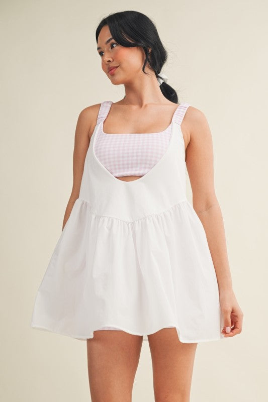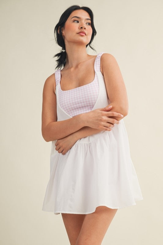 Fun, flirty, and designed for effortless movement. The Double Layered Play Dress features a breezy, layered silhouette with a built-in gingham print bra and shorts, providing coverage, support, and playful style in one piece. Crafted from lightweight, breathable fabric, it is perfect for active days, casual outings, or athleisure styling. SELF: 92% NYLON 8% SPANDEX CONTRAST: 82% POLYESTER 18% SPANDEX HPS S: 25" M: 25 3/4" L: 26 1/2"