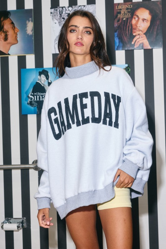 'FOOTBALL & GAMEDAY' Print Reversible Mockneck Sweatshirt - Mock-neck - Drop shoulder, long sleeves - Softest cozy fleece - Oversized fit - Rib banded hemline and cuffs - The reversible design lets you switch up your style.