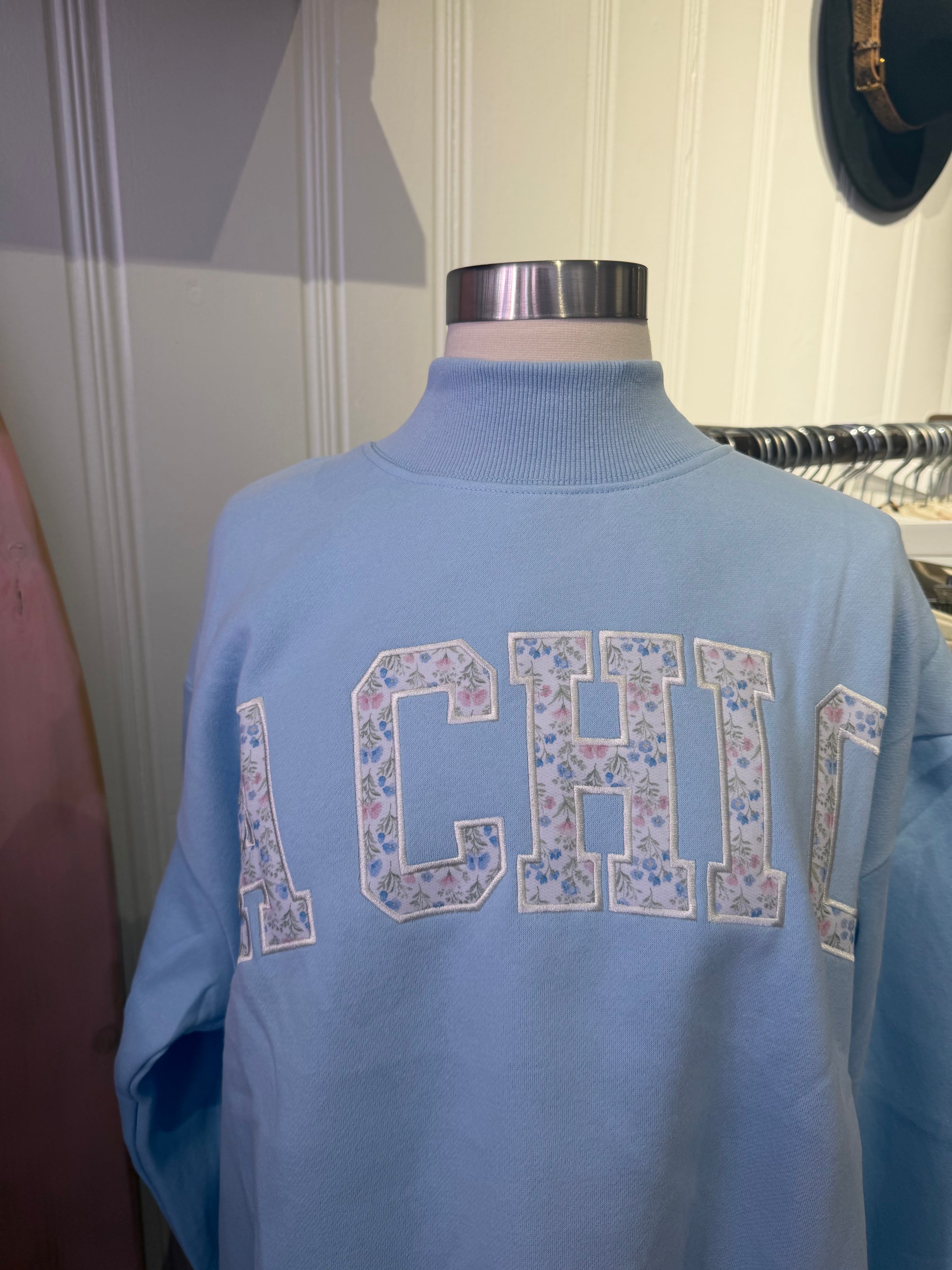 Add some sorority flair to your wardrobe with our Sorority Mockneck sweatshirt. Featuring floral embroidery, this baby blue mockneck is perfect for showing off your sorority pride. Stay cozy and stylish with this playful addition to your closet. (Sisterhood never looked so good!)